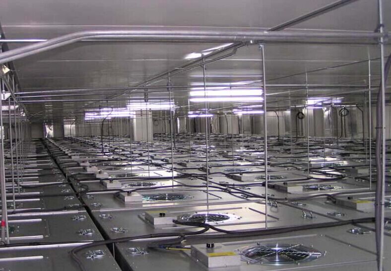 是風機和FFU高效過濾器的組合,也可稱為“自帶風機的過濾設備”。FFU通常安裝在潔凈室 的送風末端,一般放置在吊裝的“干式”墊片密封龍骨框架上。FFU上面部分為風機模塊,下面部分為過濾 器。根據潔凈度的要求,過濾器可為不同等級的高效(HEPA)或超高效(ULPA)過濾器,為潔凈室提供潔 凈空氣。風機模塊除了要克服FFU下部高效過濾器的阻力,還要克服整個循環風所有通道部件的阻力,從而 維持設定的運行風速。FFU系統具有設計施工簡便,風速調節靈活,潔凈區易于變更等特點,因此已成為工業潔凈室的流行系統形式之一。