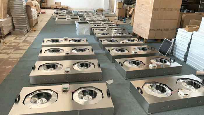 FFU確切地說是一種自帶動(dòng)力、具有過濾功效的模塊化的末端送風(fēng)裝置。風(fēng)機(jī)從FFU頂部將空氣吸入并經(jīng)HEPA過濾,過濾后的潔凈空氣在整個(gè)出風(fēng)面以0.45m/s±20%的風(fēng)速均勻送出。