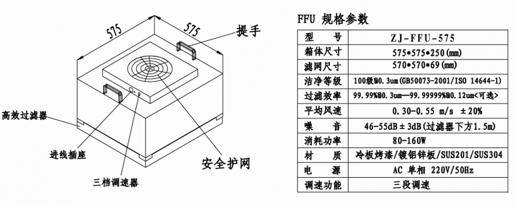 ZJFFU575方案圖及FFU技術參數說明,FFU廣泛應用于各種潔凈無塵室。