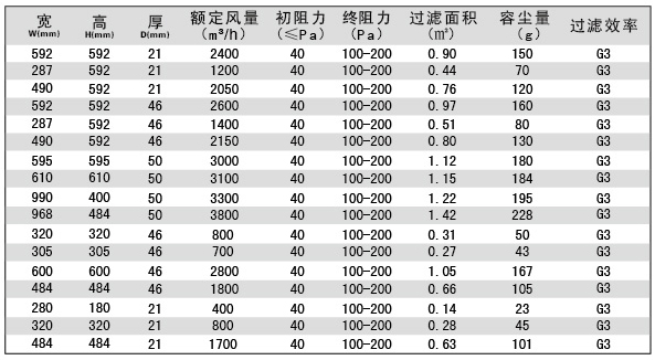 用戶選購(gòu)指南-板式初效活性炭過濾器技術(shù)參數(shù)